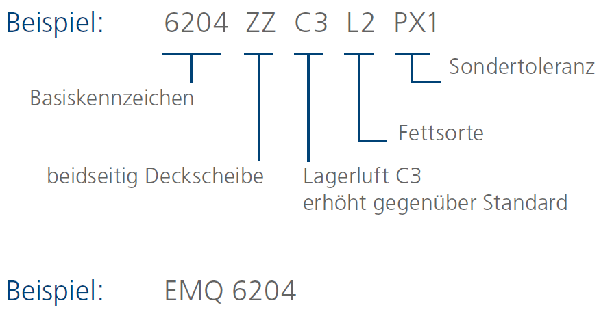 Als Nachsetzzeichen werden z.B. Käfigausführungen, Deck-/Dichtscheiben, etc. verschlüsselt. Die wichtigsten Kurzzeichen sind nachfolgend aufgeführt: